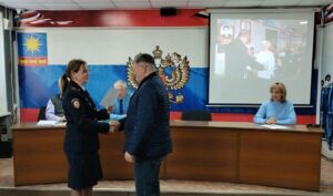 От имени председателя Совета ветеранов УМВД Приморья, вручила майору полиции в отставке Петру Козину почетную грамоту за активную работу в ветеранском движении и помощь в становлении молодых сотрудников органов внутренних дел.