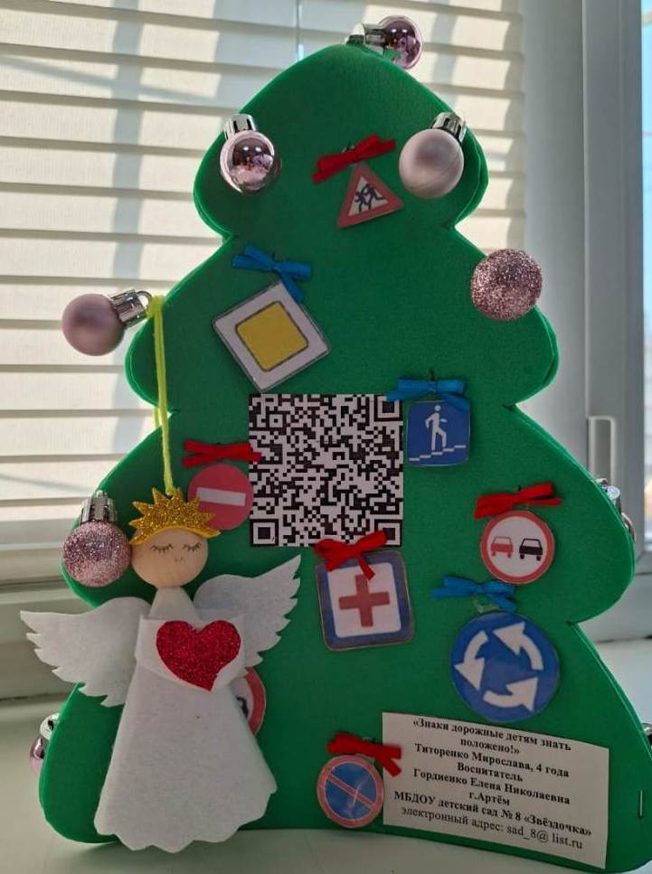 Работа Мирославы Титоренко, воспитанницы детского сада № 8 «Звездочка», выполненная под руководством Елены Гордиенко называется «Знаки дорожные детям знать положено». Она выполнена в форме новогодней ели, на которой в качестве игрушек – дорожные знаки. Новогодняя красавица является наглядной агитацией для маленьких пешеходов.