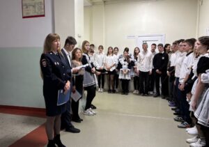 Старший лейтенант полиции Татьяна Прилуцкая рассказала школьникам о службе в полиции, о системе высшего образования в МВД России, о социальных гарантиях сотрудников органов внутренних дел.